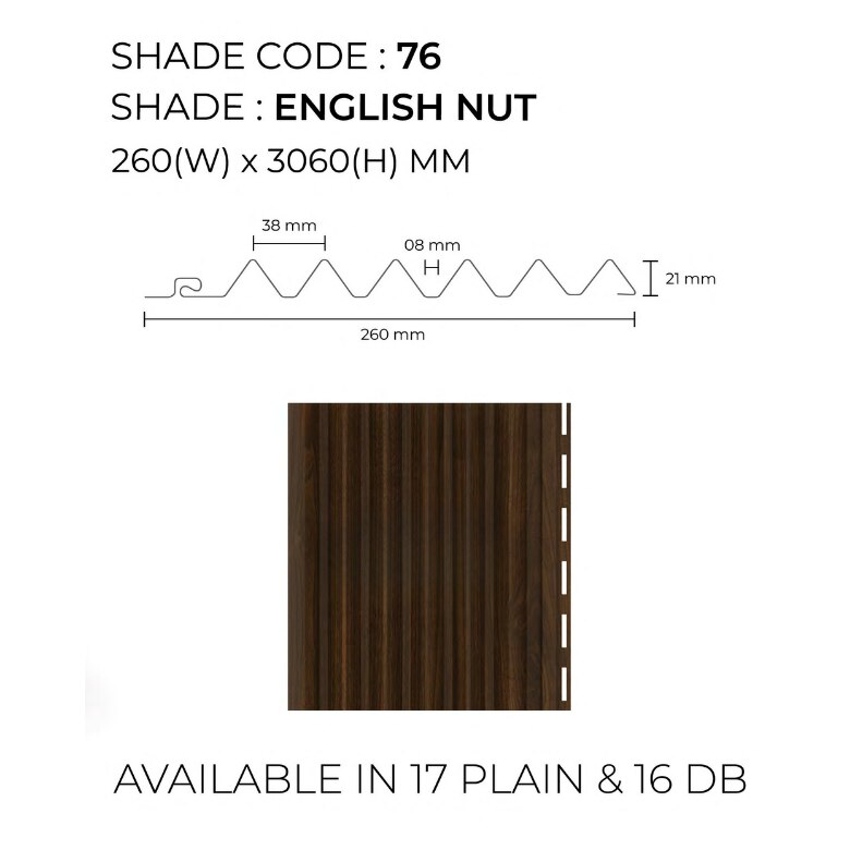Transform your interiors with English Nut Prism Wall Panels from PARE, designed for seamless applications as ceiling panels, wall panels, fluted panels, groove panels, and PVC wall panels. Featuring a classic English Nut shade, these panels bring warmth, sophistication, and a natural wooden texture to any space while ensuring durability. ✔ Size: 3060 × 260 mm ✔ Price: Mentioned per square feet ✔ Also Available In: Honey Maple, Danish Teak, Oak Noir, White Mist, Noce Grande, Gold Maple, Oak Wood Ocre, Spiced Walnut Upgrade your interiors with PARE Wooden Collection Prism Wall Panels today! 📍 Service Areas: ✔ Chennai – Adyar, Anna Nagar, Velachery, T. Nagar, OMR, ECR, Tambaram, Porur, Ambattur, Perungudi, and more! ✔ Nearby Cities – Coimbatore, Bangalore, Hyderabad, and all over India 💡 Visit: smarthomeindia.in 📞 Call us at: 9655009199 | 9655006409