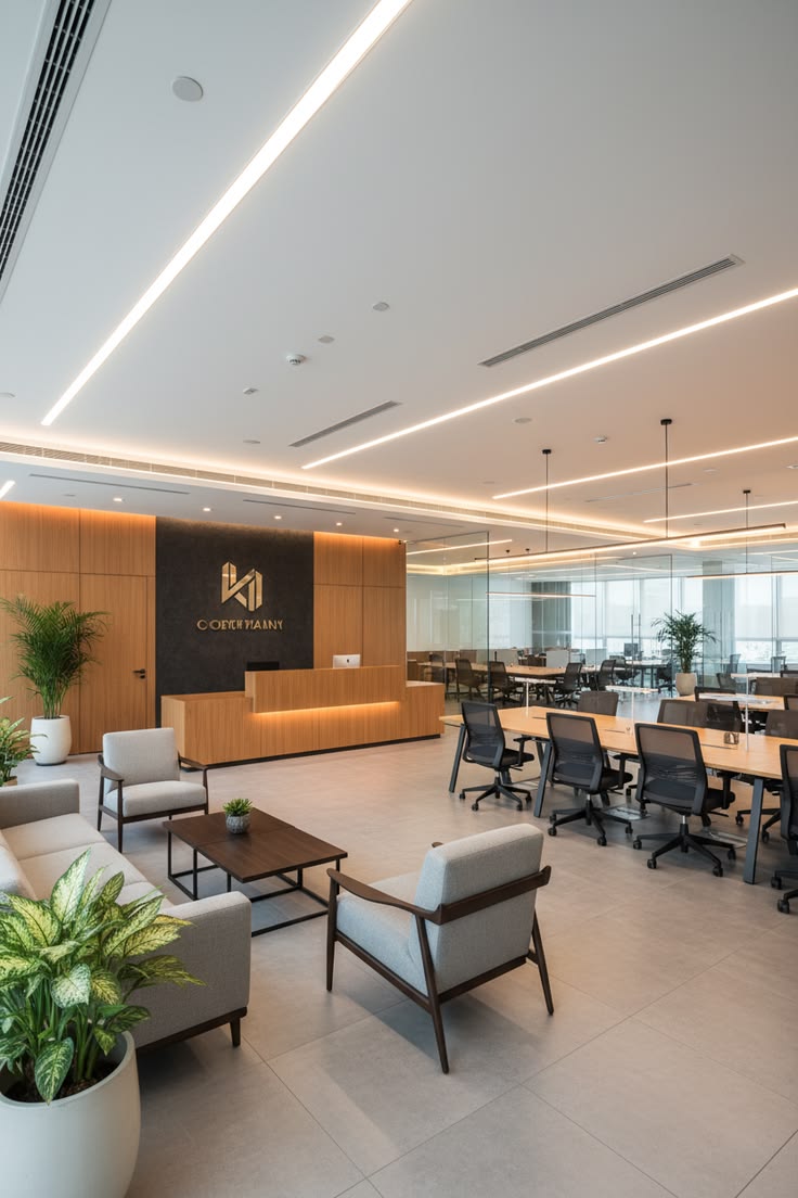 The image below showcases a premium office setup featuring a stylish reception, open workstation layout, elegant lighting, and glass partitions—perfect for businesses looking to create a lasting impression.