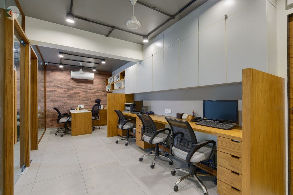 Wooden laminates are widely used in modern office interior design Tamil Nadu for their premium look.
