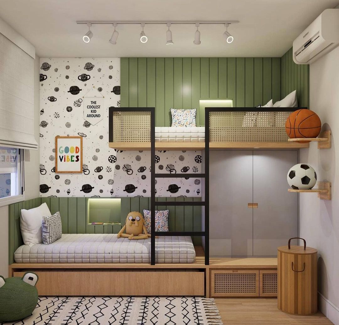 This kids’ bedroom interior features a smart and playful bunk bed design that maximizes space while maintaining a cozy and stylish look, with a calming olive green vertical panel backdrop paired with bright white walls to create a fresh and balanced atmosphere; the lower bed doubles as a seating area with built-in storage drawers beneath, while the upper bunk includes a safe railing and soft bedding, connected by a sleek black ladder that adds a modern contrast; natural materials like wood and cane paneling enhance warmth and texture, while the space-themed wallpaper, fun wall art, plush toys, and sports elements bring in a lively, child-friendly character, all complemented by ceiling track lighting and soft ambient highlights that make the room feel both functional and inviting.