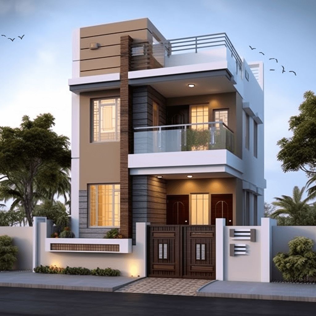This modern duplex house elevation design in Chennai uses a blend of smooth exterior cement plaster, textured wall finishes, and wooden finish cladding panels to create a clean contemporary façade suited for Chennai’s climate. The elevation features frameless glass balcony railings, powder-coated metal terrace railings, and aluminium or UPVC windows that ensure durability, safety, and ventilation. Weather-resistant exterior paint, stone-textured accent panels, and recessed LED lighting enhance visual appeal while reducing maintenance. The compound wall with MS gate, anti-skid outdoor tiles, and subtle landscaping make this elevation ideal for modern residential and duplex home designs in Chennai.
